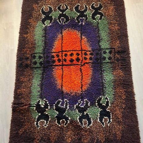 Aivan ihana peikonlehti -ryijy, joka ei valitettavasti löytänyt itselleen paikkaa minun kotoa. Sopii seinälle tai esim. pieneksi matoksi 💚