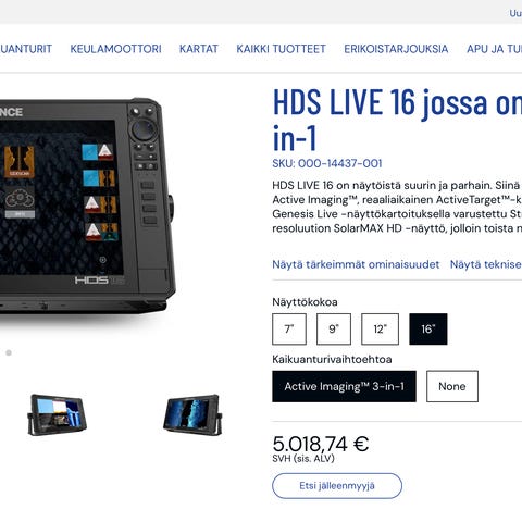 Ostan Lowrance HDS Live / HDS Pro kaikuluotaimen mielellään koossa 12-16”. Tarjoa omaasi mikäli hinnoittelet sen järkevästi, en huomioi ylihintaisia. Kiinnostaa myös pikku vikaiset yksilöt, mutta ilmoita mikä vika on kyseessä ja huomioi se myös hinta pyynnissä. Etusijalla F2F kaupat, tarvittaessa voidaan miettiä myös postin kautta kauppojen tekemistä.