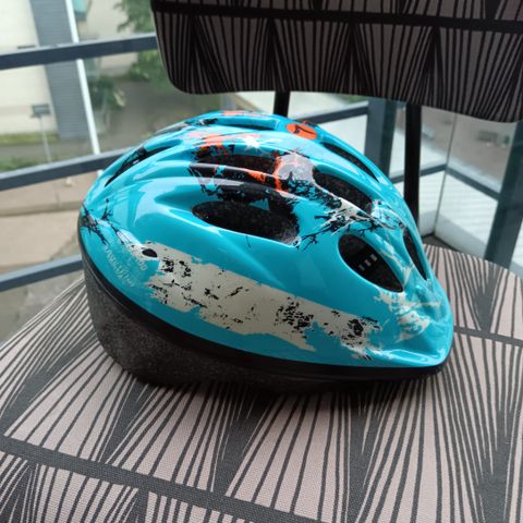 Myydään lasten pyöräilykypärä. Sininen. Dinosaurus. Kokomerkintä 48-54cm. Säädettävät päänympärys sekä leukaremmi.