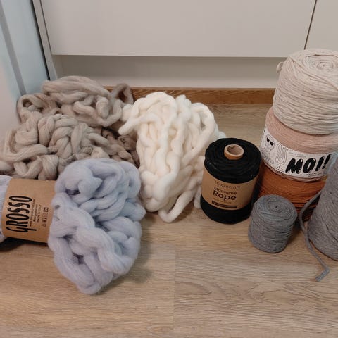 Erä käsityölankoja, macrame- ja puuvillalankoja. Mm. Novita Macrame sekä Novita Strömsö puuvillalankaa. Lisäksi on DMC Nova Vita -kierrätyspuuvillalankaa luonnonvaaleana muita vajaita keriä tummansinisenä ja keltaisena. soveltuvat esimerkiksi makramee-, virkkaus- ja neuleprojekteihin, kuten koreihin, sisustustekstiileihin ja asusteisiin. Yht. 5 väriä 9 kerää. Vihreä Novita Strömsö: väri 372, lanka 214, 150 g = 99 m 68 puuvilla 32 polyamidi, 10-12 puikot 8-10 koukku, 2 kerää. Luonnonvalkoinen Nova Vita, makrame: 250 g, 80 puuvilla 20 polyesyer, 12 mm puikot/ koukku, 2 kerää. Harmaa Novita Macrame: 400 g, 85 puuvilla 15 muita, 8-10 puikot/koukku 1 kerä. 2 isoa sinistä kerää ilman vyötettä. 2 pienempää keltaista kerää ilman vyötettä.