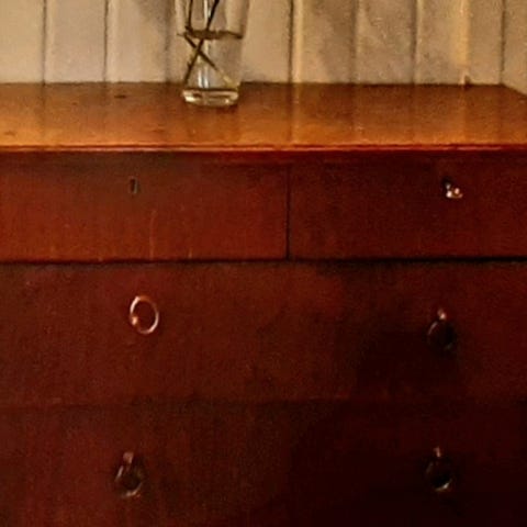 Puinen ruskea lipasto, jossa on kolme laatikkoa.