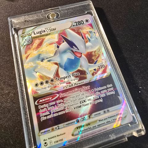 Pokémon Lugia VSTAR keräilykortti. Holografinen kortti, jossa Lugia-hahmo ja VSTAR-mekaniikka. Kortin etupuolella näkyvät hyökkäysten tiedot, elämäpisteet ja energiasymbolit, takapuolella perinteinen sinireunainen Pokémon-kortin tausta. Sopii Pokémon TCG -peliin tai kokoelmakortiksi. Postit +3€