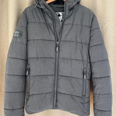 Lämmin, mutta kevyt Superdry toppatakki irrotettavalla hupulla. Koko miesten M. Vasemmassa kainalossa pieni vaalea jälki (kuva), joka ei näy käytössä.