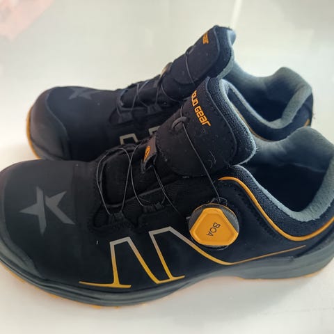 Laput edelleen kiinni ja kengät omassa laatikossaan. Väriltään hiekanväriset turvakengät, joissa nauhakiinnitys ja sivuvetoketju. Kengissä on paksu ja kuvioitu ulkopohja, joka on suunniteltu tarjoamaan pitoa erilaisilla alustoilla. Malli on S3-luokiteltu turvajalkine, jossa on varvassuoja ja pohjan läpäisysuoja. Sopii työ- ja suojajalkineeksi ympäristöihin, joissa tarvitaan turvakengiltä suojaavia ominaisuuksia ja tukea jalalle.