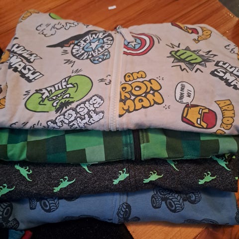 Kaikki käytettyjä. Osaa enemmän osaa vähemmän. Nyppyä ja haalistumaa osissa vaatteissa. En syynännyt mutta tahrattomilta näyttää. Toki voi jotain olla mikä ei osunut silmiin. Kauluspaitaa ommeltu hihasta muuten ehjiä. Koot 130-134-140.