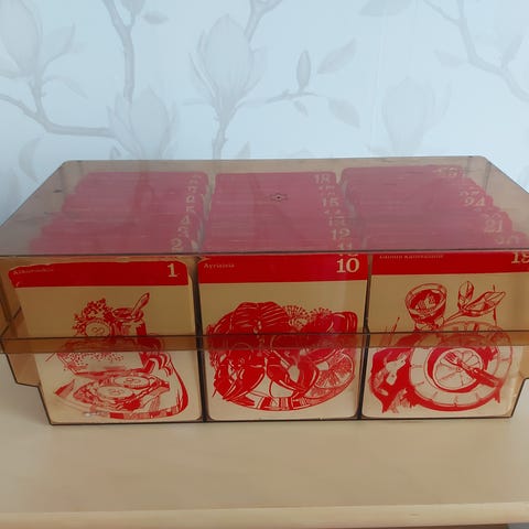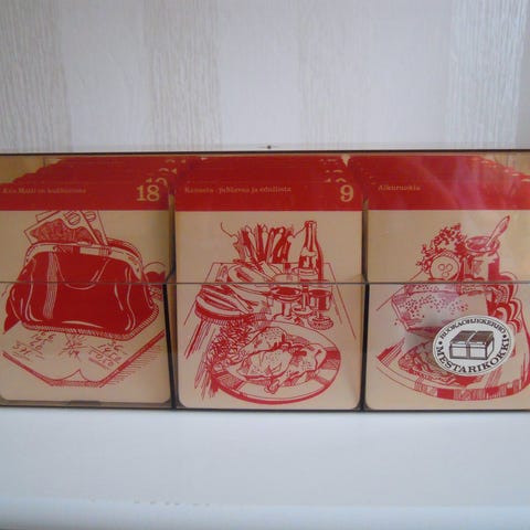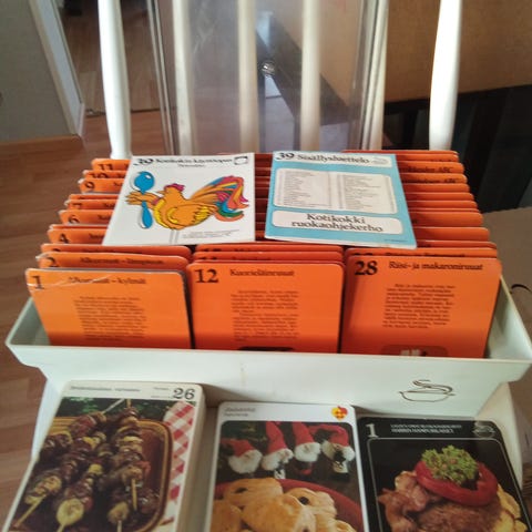 Laatikollinen (6kg) Mestarikokki ruokaohjekerhon reseptikortteja. Osassa käytön jälkeä ja osa uutta vastaavassa kunnossa. Laatikossa käytön jälkeä ja ajan patinaa. Perusohjeita ja erikoisuuksia.
