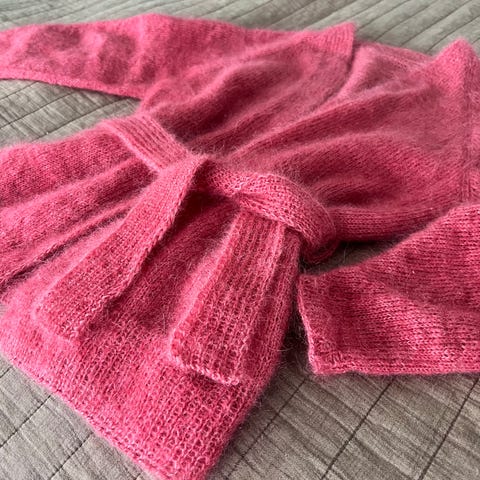 Upea mohairvillaneule, Ihanan kevyt, pehmeä ja lämmin. Värikin aivan upea. Harmikseni liian suuri omaan makuun, vaikka väljä kuuluu ollakin.