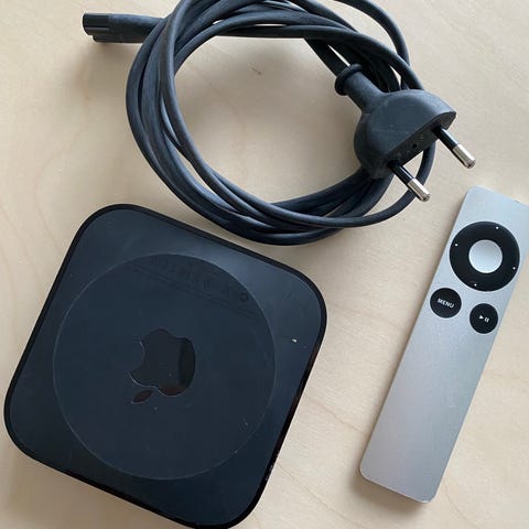 Kolmannen sukupolven Apple TV. On hyvässä kunnossa ja toimii niinkuin pitääkin. Pienta kosmeettista vauriota toki löytyy, mutta tuota naarmuakin salama aika paljon korostaa kuvassa. Mukaan tulee kaukosäädin ja virtajohto.