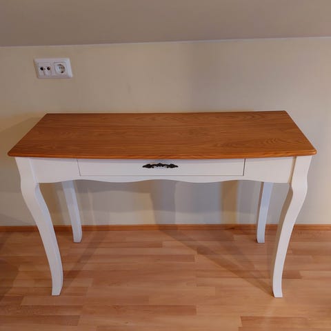 Kaunis ja siro puinen puolipyöreä sivupöytä. Pöydässä on tummanruskea puupinta ja käännetyt jalat. Yläosassa on laatikko pienten tavaroiden säilytykseen. Sopii käytettäväksi esimerkiksi eteisen, olohuoneen tai makuuhuoneen sivupöytänä tai konsolipöytänä seinän vieressä.