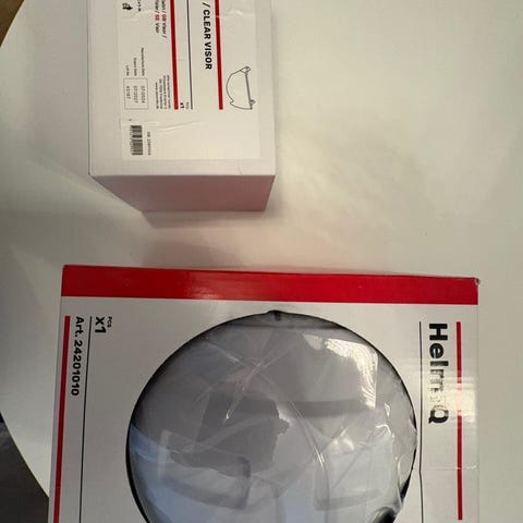 Huom. kypärästä otettu leukahihna pois. Kypärää ja kirkasta visiiriä käytetty enemmän, mutta verkkovisiiri, kuulonsuojaimet, niskasuoja uudenveroisia. Hikipanta uusi paketissaan.