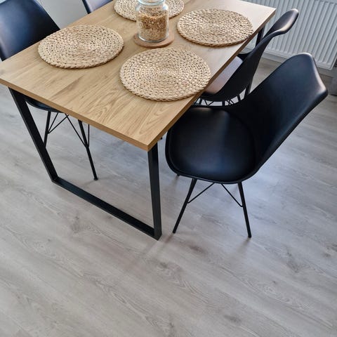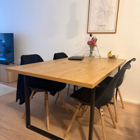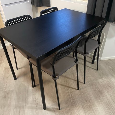 Myynnissä siistikuntoinen Jyskin ruokapöytä ja neljä harmaata tuolia.