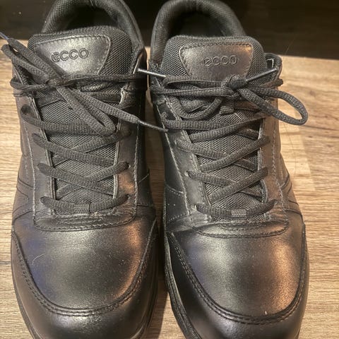 Ecco tennarit, koko 44. Väriltään mustat, päällinen nahkaa ja nauhakiinnitys. Malli on matalavartinen ja sopii arkikäyttöön. Pohja on kumia ja kuvioitu paremman pidon takaamiseksi. Kenkien sisäosa on pehmustettu käyttömukavuuden lisäämiseksi.
