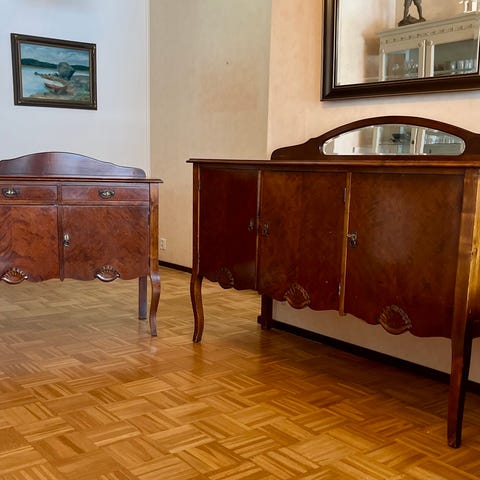 Senkki puinen ruskea rokokoo tyylinen. Pinnoissa vuosien tuomaa kulumaa. Kork pinta 80, koristeen kohdalla 90cm