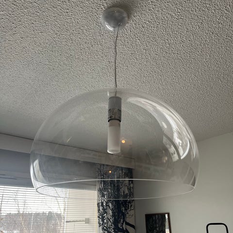 Kartellin FL/Y salvianvihreä kattovalaisin. Kupu on akryyliä, joten herkästi naarmuuntuvaa. Muutamat naarmut löytyy, yritin niistä kuvaa ottaa, mutta halutessaan voin tarkemmin koittaa kuvata.