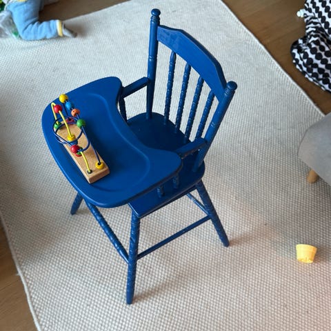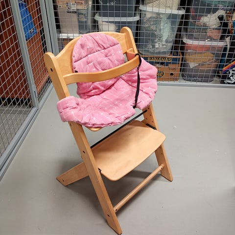 Puinen syöttötuoli, joka muuntuu pyörilläliikkuvaksi matalaksi tuoliksi ja pöydäksi. Ollut useammalla lapsella käytössä. Kunto kohtalainen, pöydässä kuulakärkikynän jälkiä.