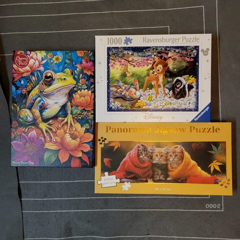 Myyn huikean hauskat koottavat That's life palapelit, 1000 palaa, 2 kpl, kuin uudet. Toisen laatikossa pieni hintalapun jättämään jälki, mutta pelit ovat laadukkaat ja palat paksut, eivätkä kiillä, vaan on ihanan tuntuiset käsitellä. Hp. 8 yht.