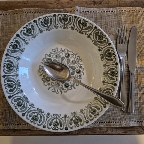 Valkoinen lautanen, jossa tumma koristekuvio reunoilla ja keskellä. Sopii esimerkiksi keitoille, pastalle tai muille annoksille. Materiaali on lasitettu keramiikkaa / posliinia.