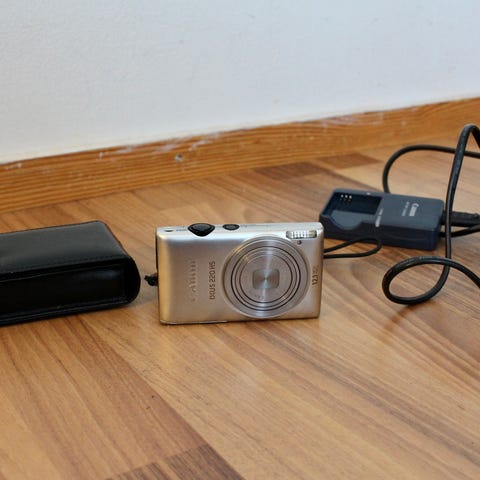 Canon IXUS 115 HS kompaktikamera pinkissä värissä. Taskukokoinen digikamera, jossa kiinteä objektiivi ja sisäänrakennettu salama. Takana suuri näyttö kuvien katseluun ja valikoiden selaamiseen sekä peruspainikkeet kuvaustilojen ja asetusten hallintaan. Kamerassa on rannelenkki kiinnitettynä. Rungossa on käytön jälkiä ja pieniä naarmuja, jotka näkyvät kuvissa. Muuten täysin toimiva.