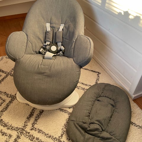 Vauvan sitteri, jossa punamusta pehmustettu istuin ja metallinen runko. Sitterissä on turvavyöt, pääntuki ja edessä kaari, johon on kiinnitetty pehmeät lelut. Keinuvat jalakset mahdollistavat rauhoittavan liikkeen, ja sivuilla olevat hihnat helpottavat kantamista. Sopii pienen vauvan lepäämiseen ja leikkihetkiin kotona.