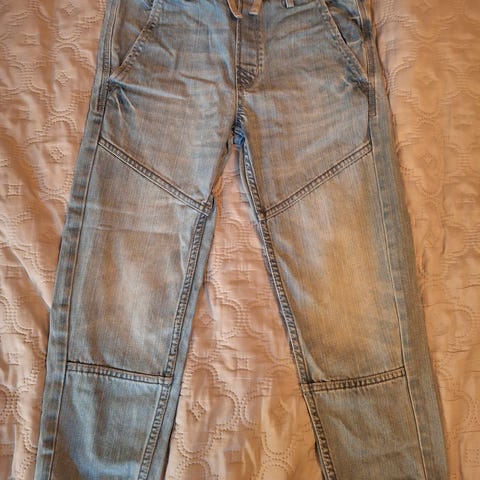 Farkkuleggingsien näköiset ihanan pehmeät ja joustavat housut, väri todella tumma navy. Koko 130, merkki 3Kids. Polvissa pehmentymää ja toisesta paikattu minijälki, edelleen kuitenkin siistin näköiset.