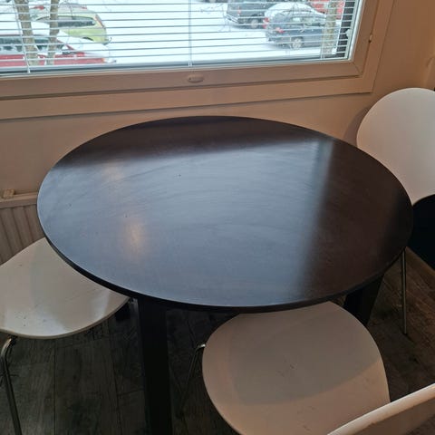 Pyöreä ruokapöytä, jossa musta pöytälevy ja pyöreä jalka. Pöydän jalka on uritettu ja massiivinen, mikä antaa sille tukevan rakenteen. Pinta on tumma ja kuvissa näkyy käytön jälkiä. Sopii ruokailu- tai oleskelutilaan useammalle istujalle. Meillä kuusi ihmistä istunut samaan aikaan. Vekestä ostettu.