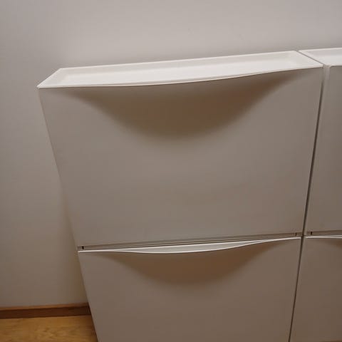 Myydään tarpeettomana Ikean valkoinen Mackapär-kenkäkaappi. Näppärä myös muiden tavaroiden säilytykseen pieneen tilaan. Siisti, en löytänyt kolhuja tai naarmuja. Ikea-laatua, mutta ajaa asiansa. Käytetty ilman jalkoja ja seinäkiinnityksiä, mutta nämä osat ovat tallessa kokoamisohjeineen ja tulevat mukaan. Seinään porattavat ruuvit eivät kuuluneet alkuperäispakkaukseenkaan, joten niitä ei luonnollisesti ole. Ylle merkatut mitat ulkomittoja ilman jalkoja. Lisää mittoja kuvissa, linkistä löytyy tarvittaessa lisätietoa tai kysy viestillä! Vain nouto. Maksu mobilepaylla tai käteisellä.