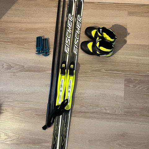 Fischer maastohiihtosukset ja monot. Sukset ovat mustat keltaisilla yksityiskohdilla, samoin monot. Tuote sopii perinteiseen maastohiihtoon. Pakettiin kuuluu suksipari siteineen, sauvat sekä yhteensopivat monot.