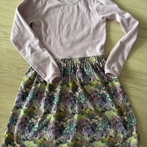 Erittäin hyväkuntoinen ja siisti molo mekko. Lyhythihainen yläosa ribbikangasta, joustaa ja venyy hyvin. Leveä kellohelma puuvillakangasta eläin ja kukka-aiheella. Kunto lähes uudenveroinen. Käytetty juhlamekkona.