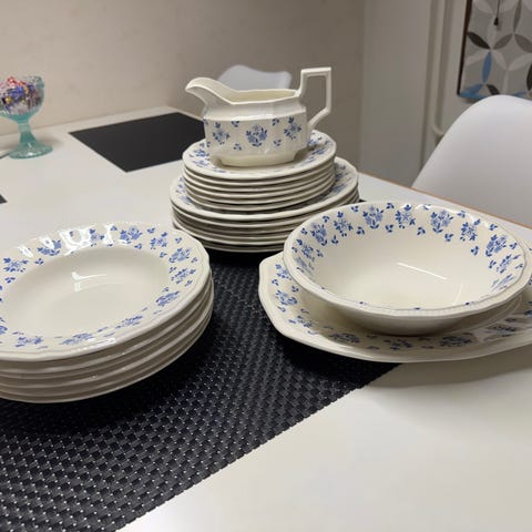 Siistissä käytetyssä kunnossa,ehjät. 6 lautasta,kaksi kulhoa ,iso hedelmäkulho ja pitkä tarjoilulautanen.