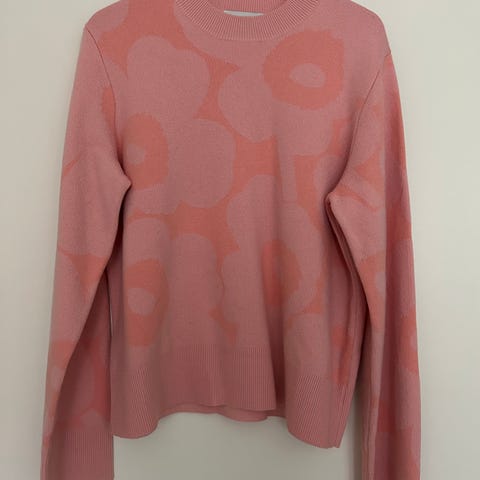 Marimekon naisten (unisex) neulepaita kokoa S. Neule on puuvillaa, ja siinä on monivärinen, vaaleanpunaisen ja vaalean sävyinen kuosikuvio. Mallissa on pyöreä pääntie ja joustinneulos helmassa, hihansuissa ja pääntiellä.