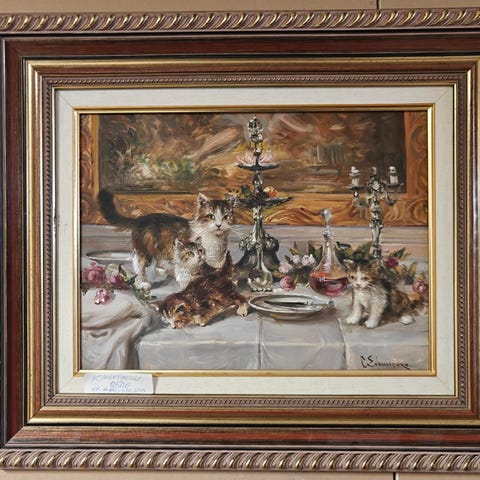 Käsintehty öljymaalaus Kissa. Taulu on teetetty tilaustyönä Kiinassa. Sisustustaulun koko on 100 x 100 cm ja se on pingotettu 93 x 93 cm kiilakehyksiin, jolloin taulun reunat peittävät kiilakehyksen 3 cm paksun reunan. Kankaan voi irrottaa kiilakehyksistä ja rullata, jolloin myös postitus onnistuu. Irrotettuna sen voi myös kehystää ns. normaaleihin kehyksiin halutessaan, jolloin myös kuva-ala on tuo 100 x 100 cm. Maalaus on tehty paksuilla vedoilla ja siinä on todella upeat ja kirkkaat värit.