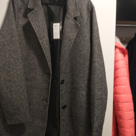 L-kokoinen hyväkuntoinen vaalenharmaa, vaalenpunaisella vuorella ja yksityiskohdilla oleva takki.