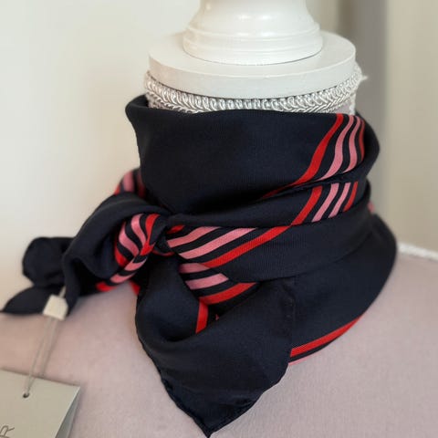 Balmuir silkkihuivi, koko noin 65x65 cm. French navy. Materiaali 100 % silkkiä. Huivi on tummansininen, jossa on vaaleanpunaisia ja punaisia raitayksityiskohtia. Sopii käytettäväksi kaulahuivina, hius- tai asustehuivina. Yksi koko. Huivi on Balmuir alkuperäispakkauksessa, joten sopii vaikka lahjaksi.