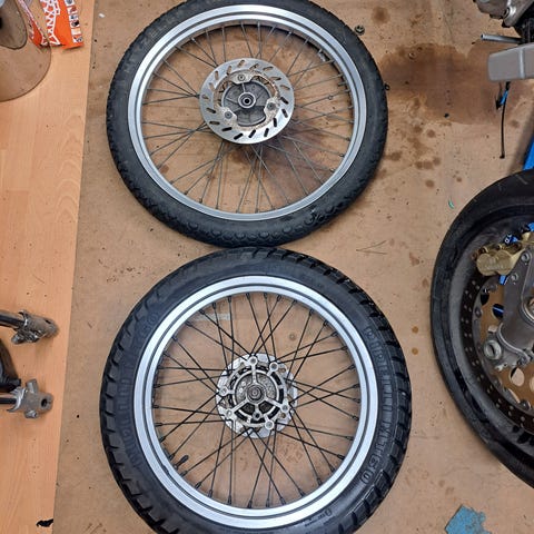 Elämää nähneet mutta ehjät vanteet, kumit aika loppu mutta pitää ilmaa, 12mm akselille, ollut derbi sendassa.