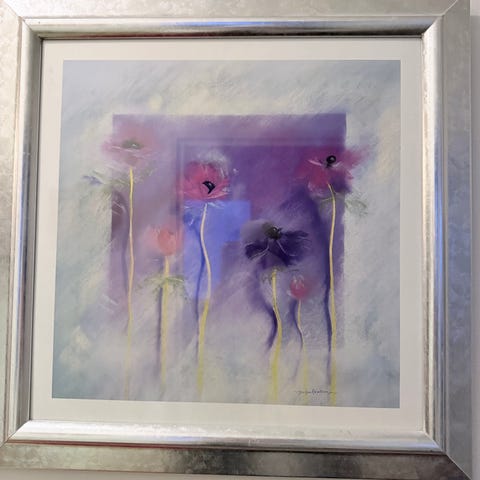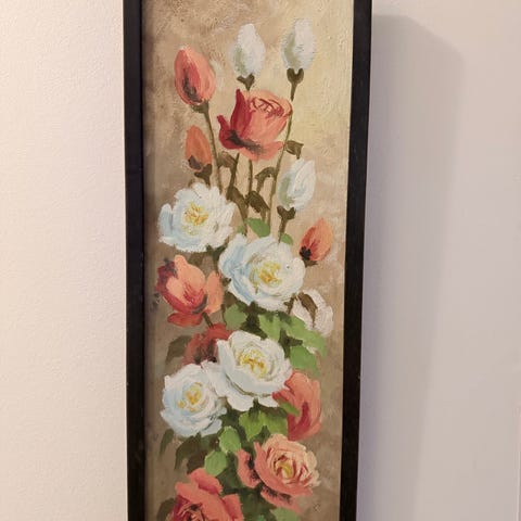Aune Ryhäsen signeeraama öljymaalaus, jossa on vaaleasävyinen kukka-aihe. Teoksessa on pääosin lilan, vihreän ja vaalean sävyjä. Maalaus on kehystetty kapeilla kultaisilla kehyksillä. Sopii seinälle sisustuselementiksi esimerkiksi olohuoneeseen tai makuuhuoneeseen.