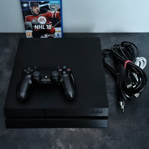 Konsoli on musta PS4-malli jossa muistia 500gb. Mukana yksi langaton Sony DualShock v2 -ohjain. Laitteessa on HDMI-liitäntä, verkkoliitäntä (LAN) sekä USB-portit. Kuvissa näkyvät Fifa 18 ja NHL 17 pelit kuuluvat pakettiin.
