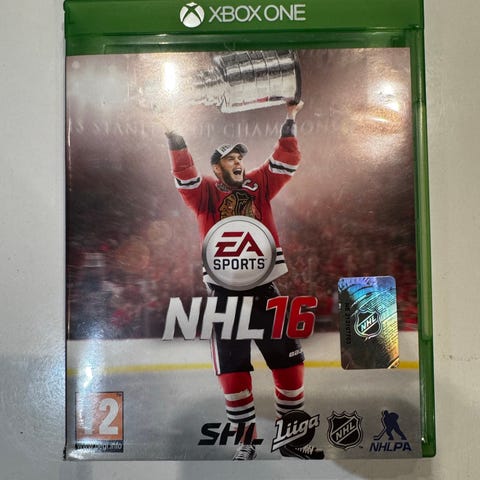 EA Sports NHL 16 Xbox One -peli. Jääkiekkoaiheinen urheilupeli, ikäraja PEGI 12. Pelissä on mukana NHL- ja SHL-liigojen joukkueita ja pelimuotoja sekä mahdollisuus pelata yksin tai moninpelinä Xbox One -konsolilla.