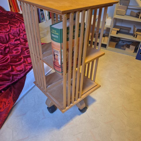 Tumma hyväkuntoinen kirjakaruselli. Kansi 42.5x42.5 cm. Korkeus 99.5 cm. Välien korkeus n27 cm ja välin syvyys 15.7 cm