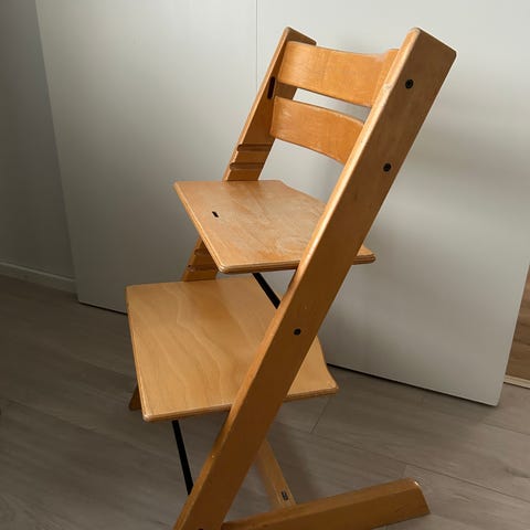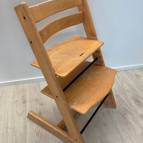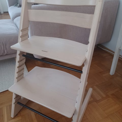 Stokke Tripp Trapp syöttötuoli, valkoinen puu. Tuoli on ehjä ja toimiva, mutta kuvien mukaista kulumaa löytyy. Mukana kaatumisenestopalat.