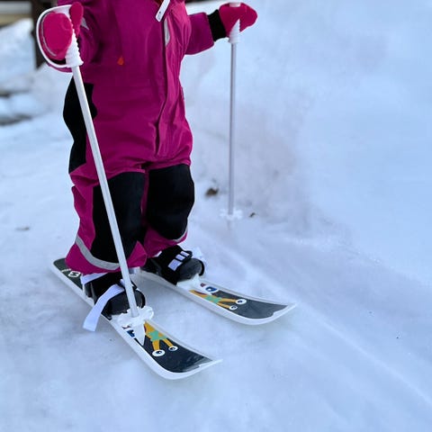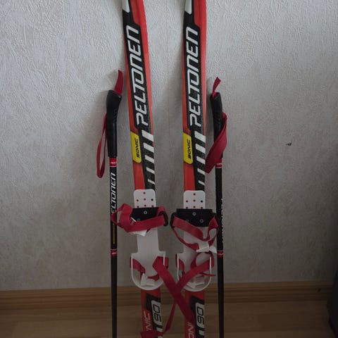 Kahdet sukset sauvoineen ja pidikkeineen, vaikka kätevästi kaksosille. Suksen mitta 150cm.