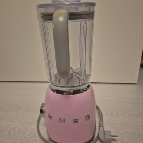 Smeg yleiskone punaisella yläosalla ja harmaalla rungolla. Laitteessa on teräksinen kulho ja läpinäkyvä roiskesuoja. Sitä on käytetty harvoin ja se on vain seissyt keittiössä. Nopeutta voidaan säätää laitteen yläosassa olevalla liukusäätimellä.
