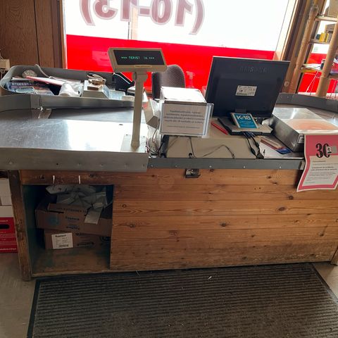 Myydään vanha kangaskaupan vaaka vitriini / myyntitiski.