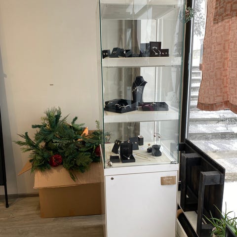 Vitriini painaa kuin synti ja on kestänyt arvatenkin kovaa käyttöä useamman kymmenen vuotta. Lasipinnoissa, ovissa ja hyllyissä on naarmuja ja pieniä lohkeamia on joissakin nurkissa. Silti oikein toimiva ja hyvä peli sekä esittelyyn, myyntiin että paketointiin.
