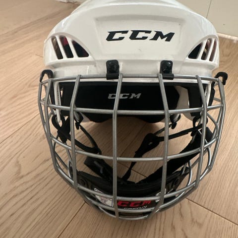 CCM Fitlite 50 jääkiekkokypärä. Väri valkoinen, edessä metallinen ristikkokasvosuoja. Kypärässä on säädettävä leukahihna ja tuuletusaukot. Sopii jääkiekkoon ja muuhun jääurheiluun, jossa vaaditaan pään suojausta.