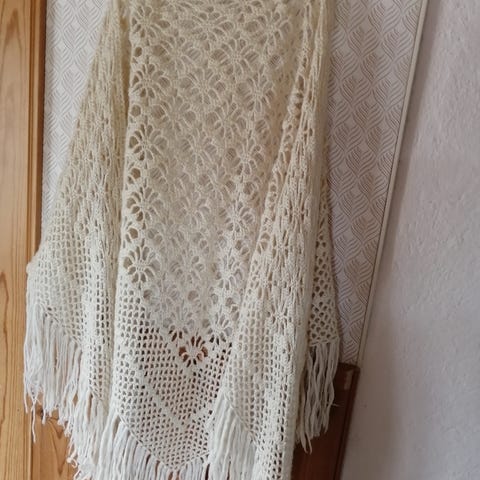 Käsinvirkattu todella hyväkuntoinen kolmion muotoinen sinapinkeltainen hartiahuivi.