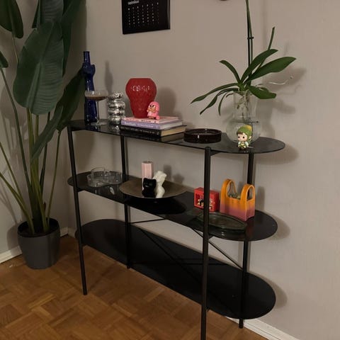 Pöydän runko on maalattua puuta ja yläosa lasia, mikä mahdollistaa esineiden esillepanon pöydän sisällä.