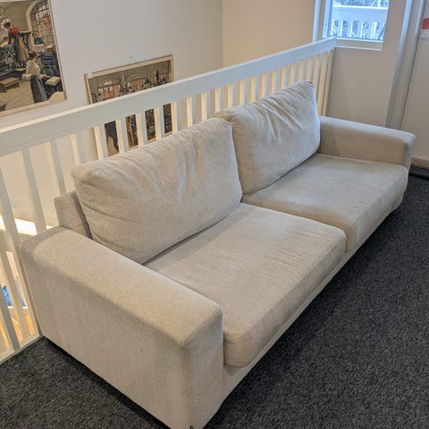 Hyväkuntoinen sohva. Vaatii tekstiilipesuria päätyihin. Kankaat ehjät ja konepestävät. Väri beige. Laadukkaat kylmävaahtotäytteiset tyynyt, jotka ei mene käytössä pilalle tai muodottomiksi. Paras löhösohva ja tosi hyvä istua!