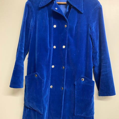 Harmaan sininen/sinisen harmaa vakosamettitakki. Koko 3. Arvioisin, että S/M.