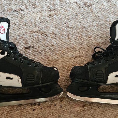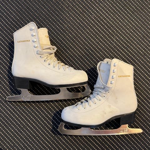 Oikean jalan luistimessa pinta hieman rikki yhdestä kohtaa (näkyy kuvassa), muuten ehjät luistimet. Koko 34, vain nouto Espoo Bemböle