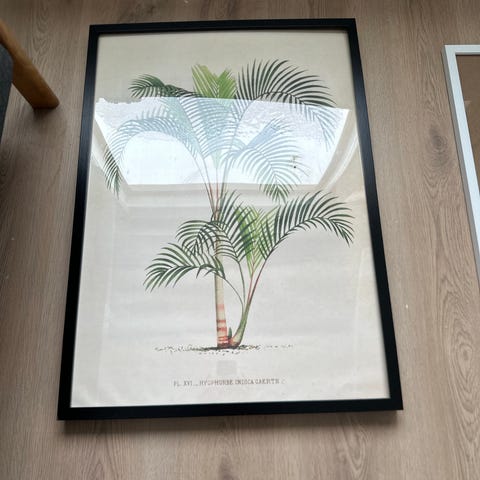 Suuri noin 64 x 94 cm taulu, mustavalkoinen ja valkoiset kehykset.